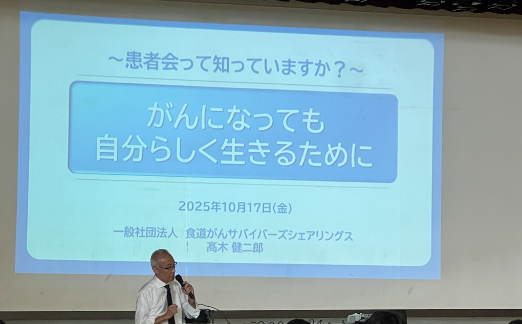 高木さん(がん経験者)「がんになっても自分らしく生きるために」をテーマに講演。手術と治療、副作用・後遺症と向き合いながら、患者会(ピアサポート)の意義を語りました