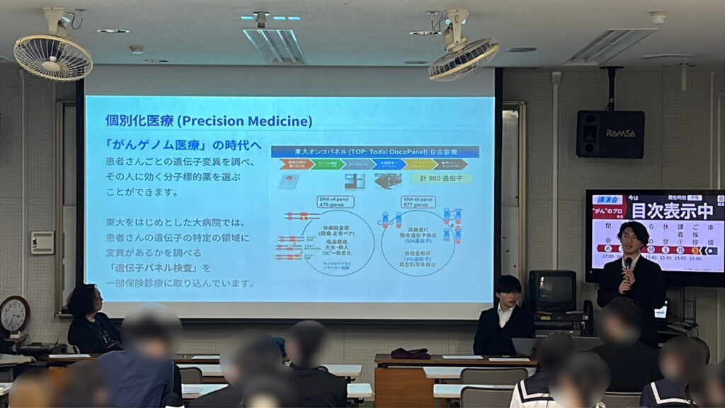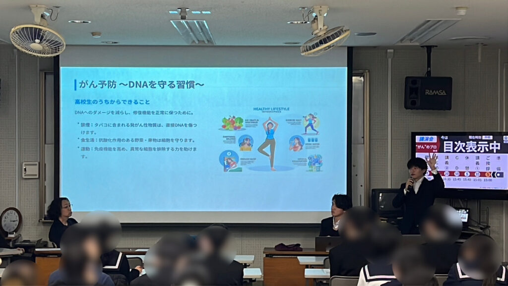 授業後半には質疑応答の時間が設けられ、生徒からは「がんはどこにできるのか」「感染とがんの関係」「予防のために今できること」など、積極的な質問が寄せられました。