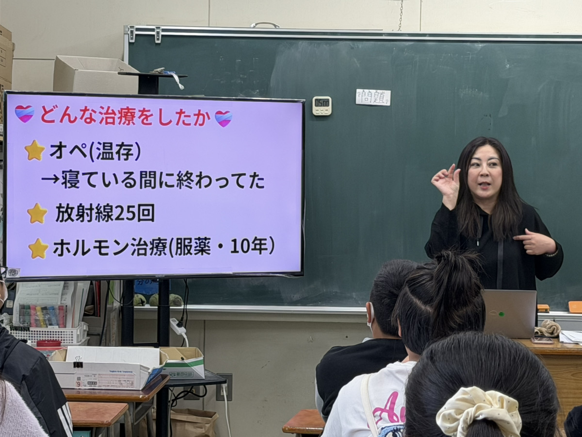 藤原さんは、入浴中に体のしこりに気づいたことをきっかけに検診を受け、乳がんが見つかったと振り返りました。自覚症状はほとんどなく、もし検診や受診をしていなければ発見が遅れていたかもしれないと話し、症状がないから大丈夫とは限らないこと、気になる変化があったときには検査を受けることが大切であると児童たちに伝えました。