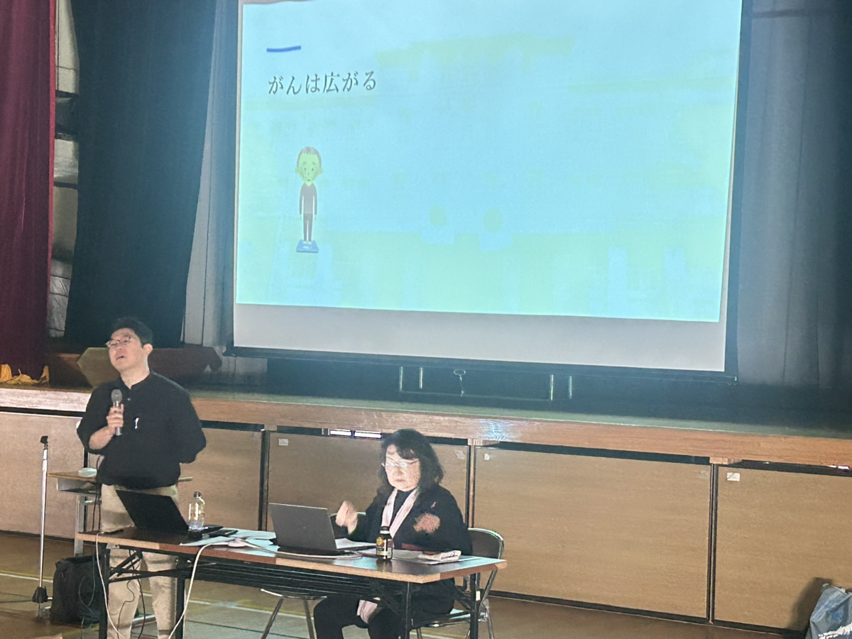 また、がん細胞は周囲から栄養を奪いながら大きくなり、血管やリンパ管を通じて別の臓器へ広がることがあることも説明されました。こうした広がりによって、体重減少、痛み、便秘、むくみなど、さまざまな症状が出ることが紹介され、生徒たちはがんが体全体に影響する病気であることを学びました。