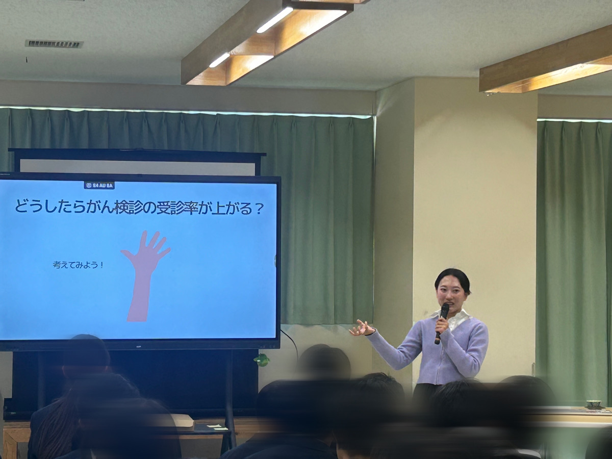 講義では、がんが身近な病気であることや、予防・検診の大切さについて理解を深める様子が見られました。また、体験談を通して、がんは治療だけでなく、その後の生活にも大きく関わる病気であることを学ぶ機会となりました。